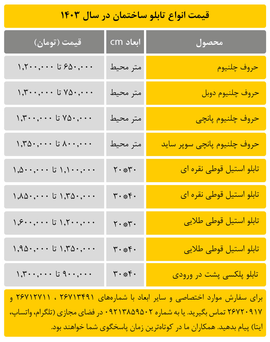 قیمت تابلو ساختمان: 750.000 تا 1.300.000 تومان به ازای هر متر محیط.