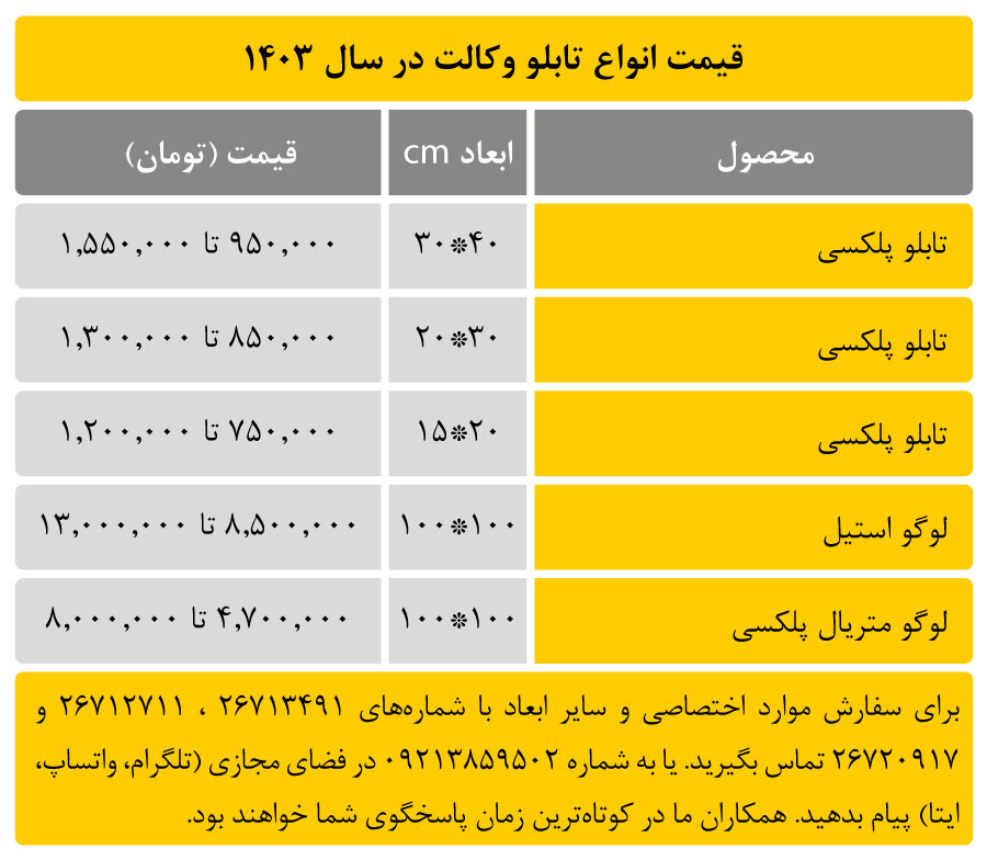 - قیمت تابلو وکیل: 900.000 تا 1.500.000 برای اندازه 100 در 100 سانتی متر (پلکسی) .