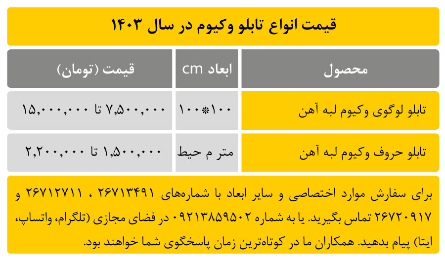- قیمت تابلو وکیوم : 7.500.000 تا 15.000.000 تومان برای ابعاد 100*100(لوگوی وکیوم لبه آهن).